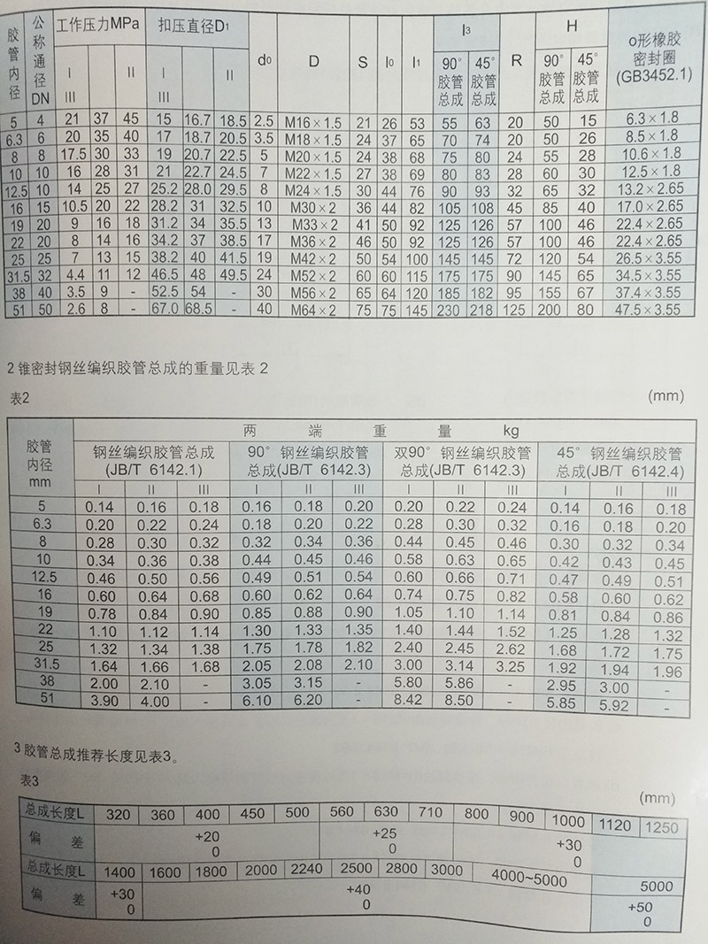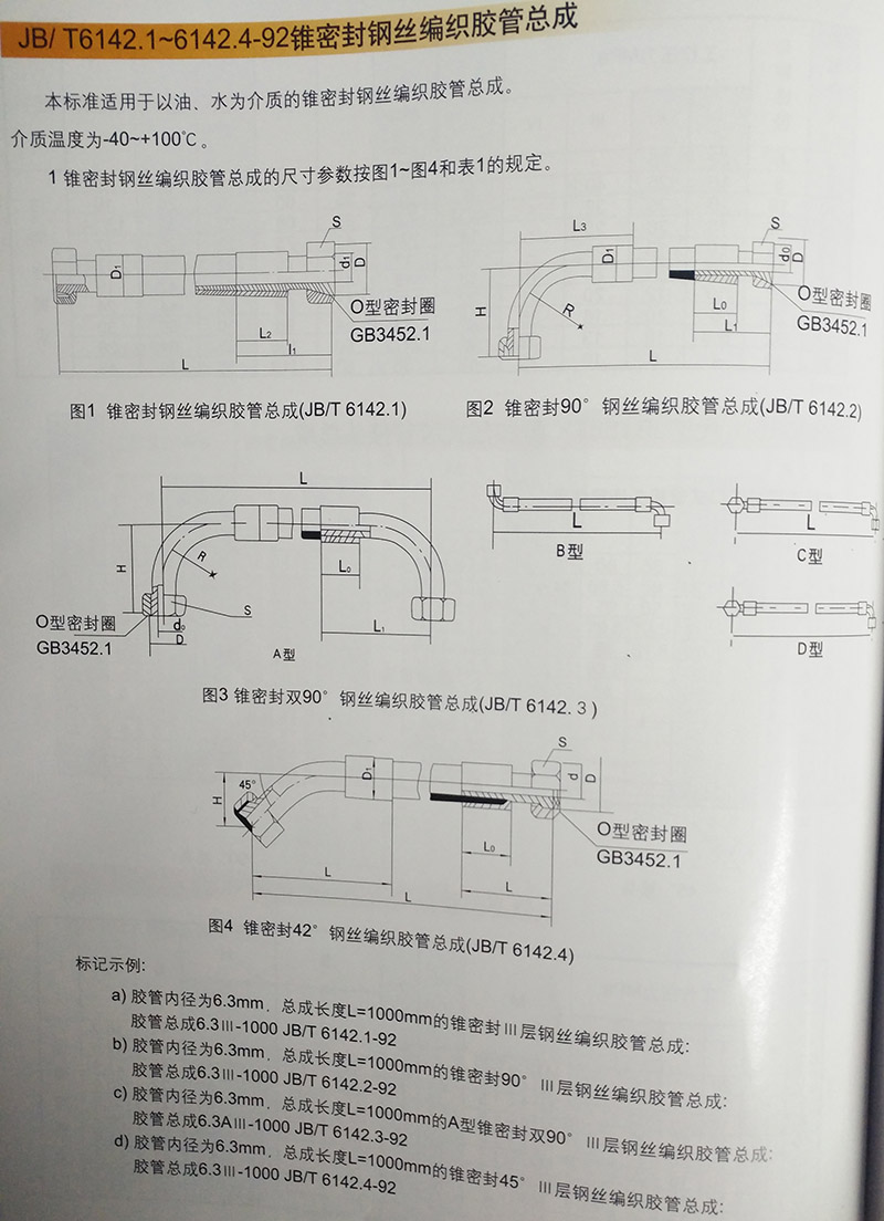 b)膠管內(nèi)徑為6.3mm,總長度L=1000mm的錐密封90°|||層鋼絲編織膠管總成: